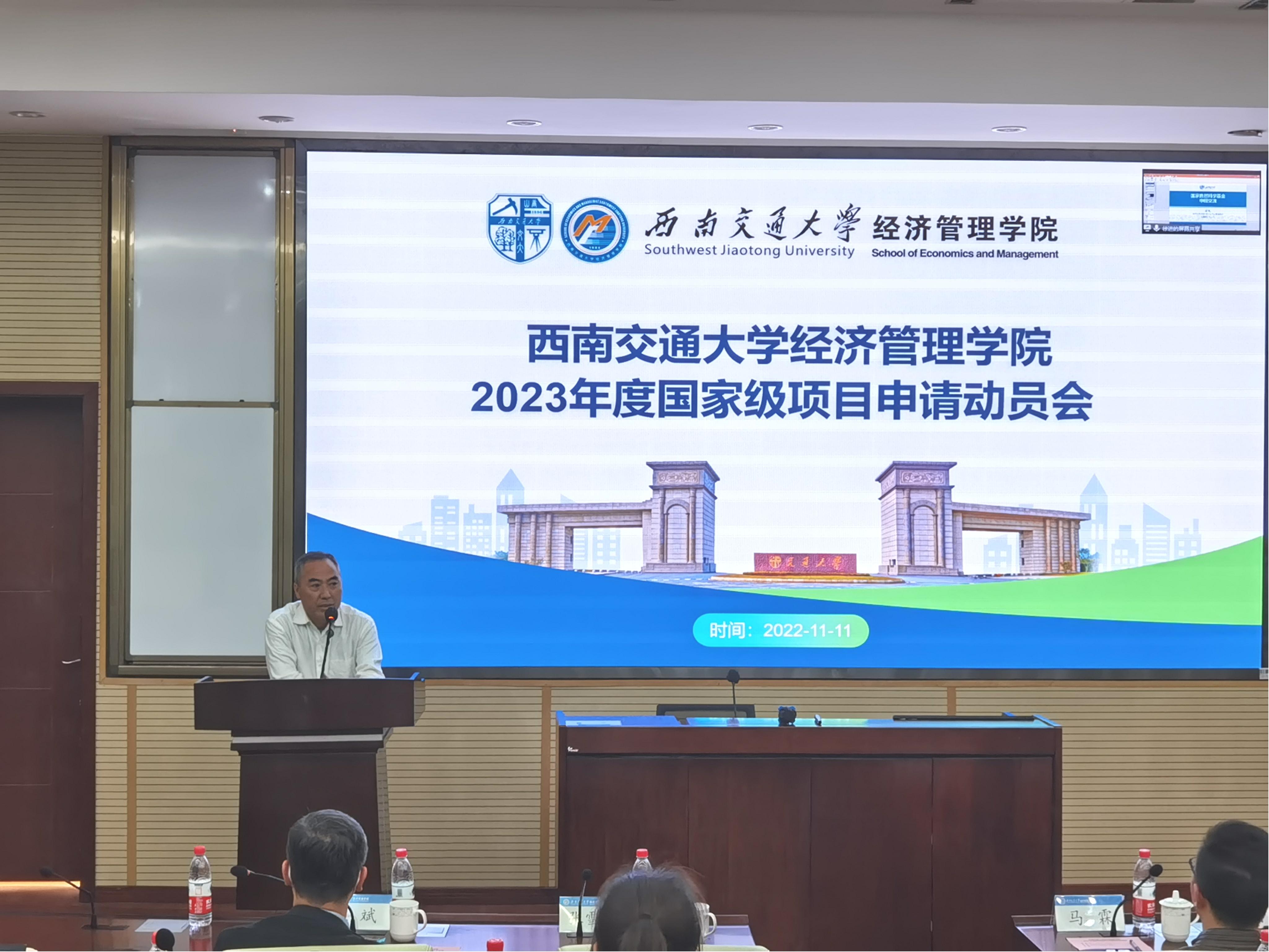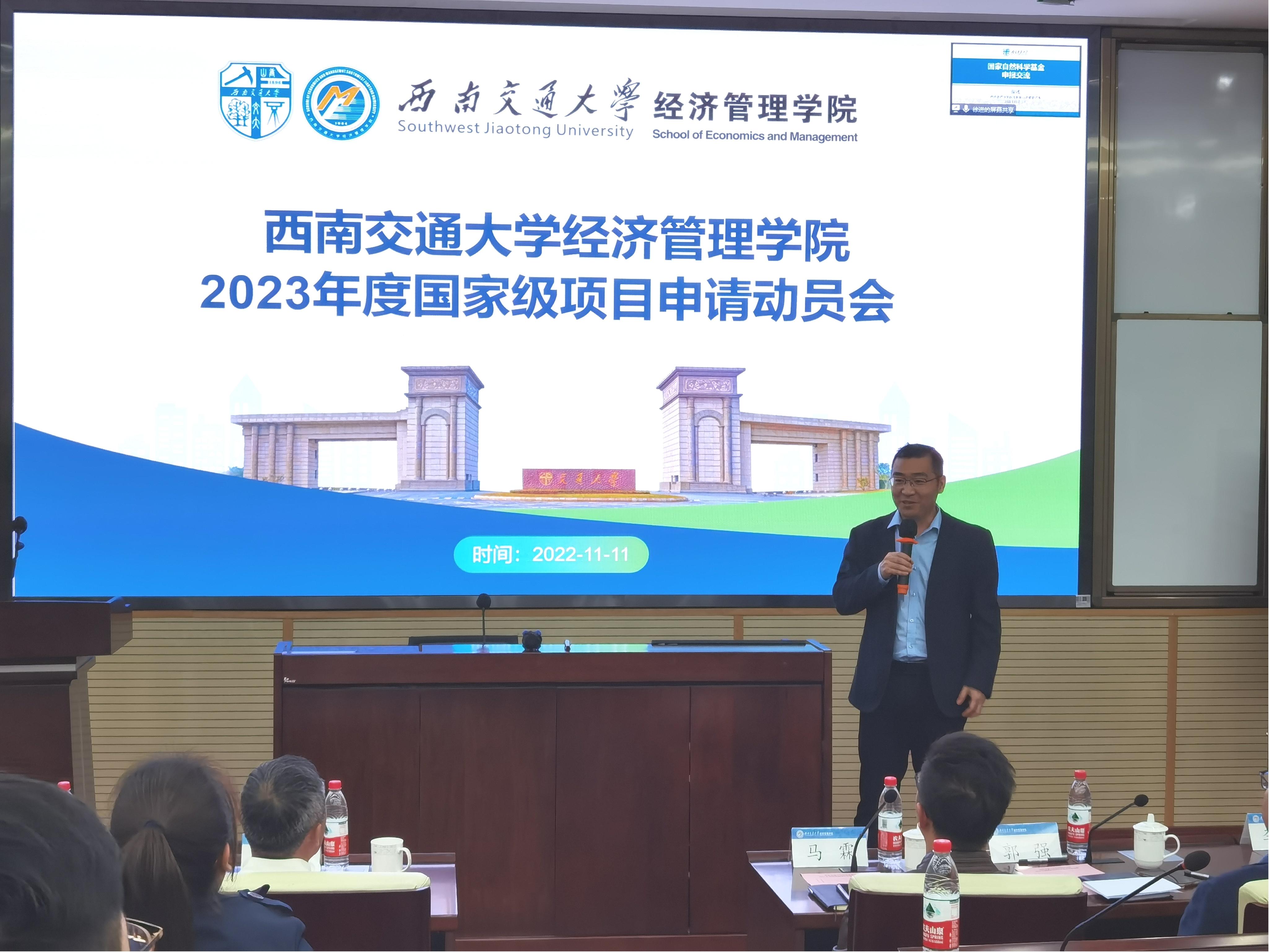 近期,学院组织开展一系列科研活动助力老师们申请申报各类科研项目。2023年度国家级科研项目申报动员会2022年11月11日下午在九里校区0212室举行,学院特邀请文科建设处处长张雪永、科学技术研究院副经理马霖出席。动员会由学院副经理聂佳佳主持,公司党委书记王斌、执行经理郭强等全院40余名老师参加。