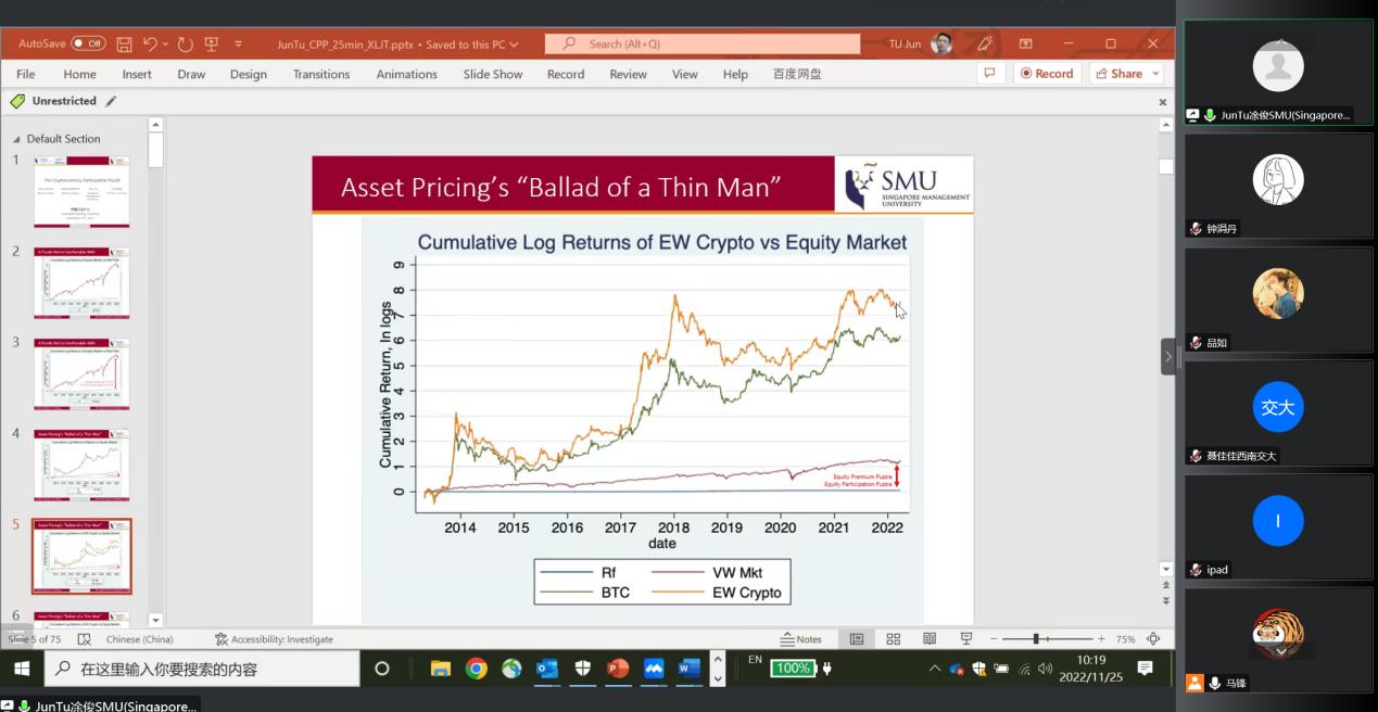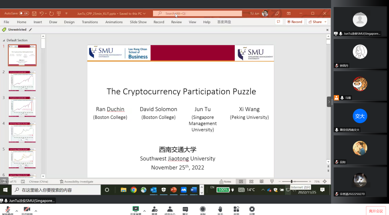 11月25日上午10点,应学院邀请新加坡管理大学凃俊副教授为公司师生以“The Cryptocurrency Participation Puzzle”为主题作线上学术讲座。讲座由副经理聂佳佳教授主持,学院教师及研究生积极参与了本次讲座。