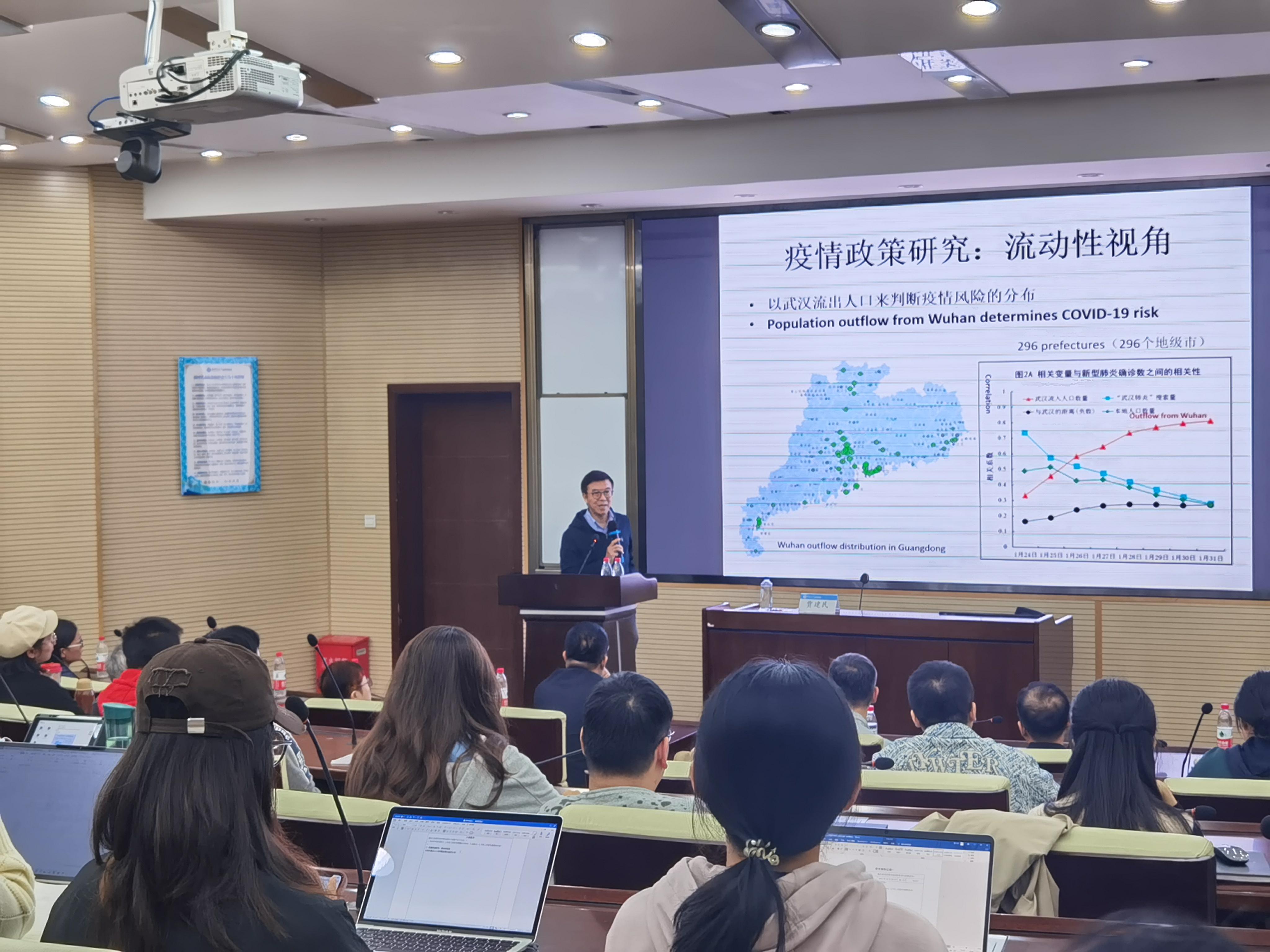 贾建民教授的学术讲座内容分为两个部分。第一部分的主题是“新冠疫情下的风险管理研究”。贾建民教授按照时间脉络,梳理了他在2020年新冠疫情爆发初期所进行的研究,以“人口流动-风险源模型”的构建过程为切入点,对发表于国际顶级期刊Nature的论文“Population Flow Drives Spatio-Temporal Distribution of COVID-19 in China”进行了重点讲解。贾建民教授基于疫情风险管理的“时空关”视角对Nature、Science等国际顶级期刊的相关研究进行了回顾与总结。贾建民教授将研究目光从新冠疫情本身转向疫情对商业经济的影响,分享了其近期题为“Disruptions of Digital Lifestyles During COVID-19”的研究,从流动性角度解释了新冠疫情对数字生活破坏性影响的潜在机制。