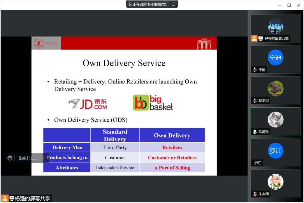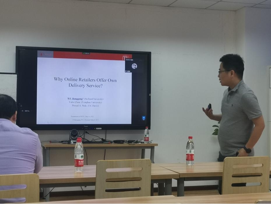2022年5月16日上午10:00,四川大学商学院吴邦刚副研究员应邀以“探索新兴市场中零售商自有送货服务的价值”为题为公司师生带来了一场精彩的学术报告。本次学术活动以线上线下同步开展,由学院市场学系蒋玉石教授主持,学院执行经理郭强教授以及学院师生30余人参加了本次讲座。