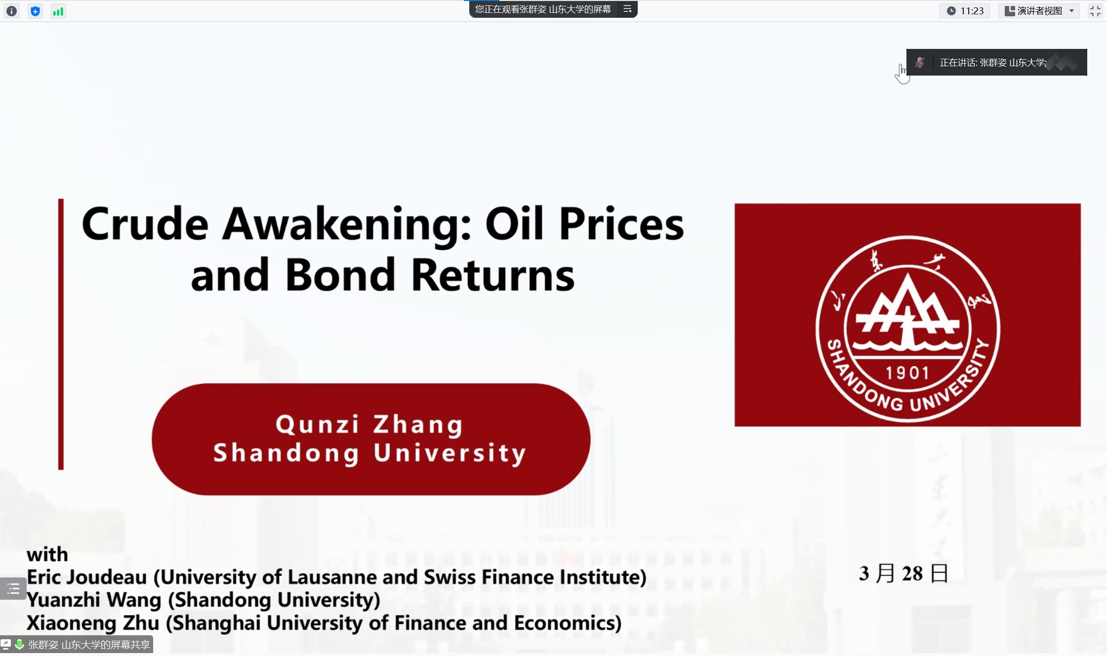 2023年3月29日上午10点,山东大学经济学院金融系张群姿教授为公司师生分享题为“Crude Awakening: Oil Prices and Bond Returns”的学术报告,讲座由HAHA体育金融与财务学系马锋副教授主持,学院老师和研究生同学积极参与了此次讲座。