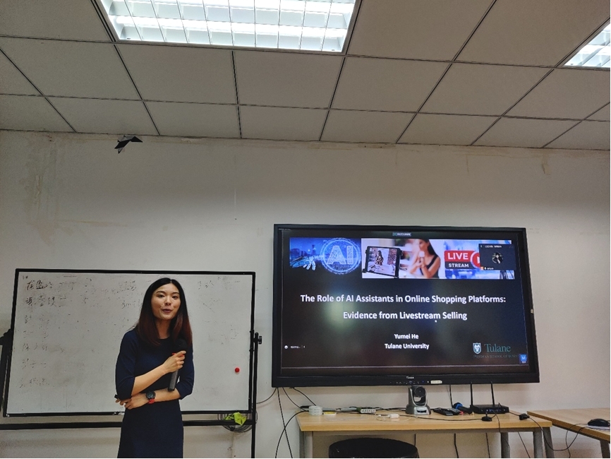 2023年6月16日上午,杜兰大学弗里曼商学院助理教授何玉梅应邀在学院0411室开展题为“The Role of AI Assistants in Livestream Selling: Evidence from a Randomized Field Experiment”的学术讲座。讲座由学院信息系统与运营管理系刘盾教授主持,公司教师徐进副教授、陈瑾轩老师,电子科技大学经济与管理学院钱宇副教授、四川农业大学商旅学院李良强老师,以及学院40名研究生参与了此次学术活动。