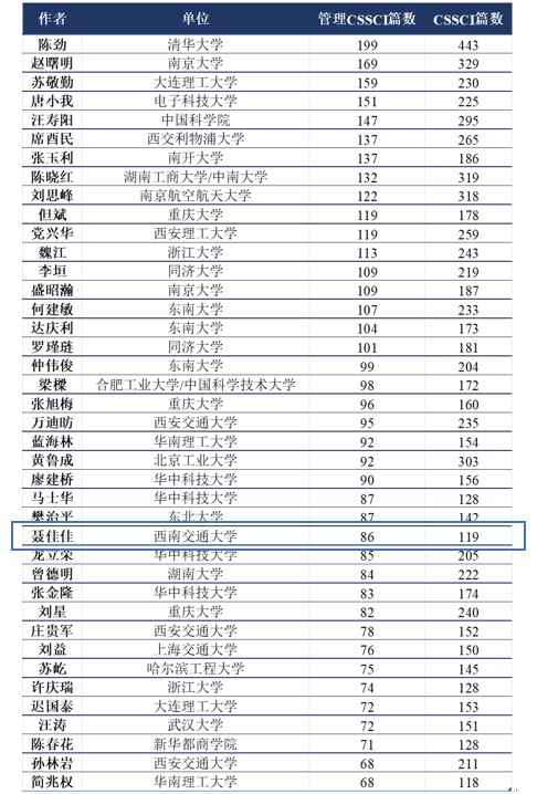 从学科专业来看,这些学者都是管理学科的著名学者,来自工商管理领域、管理科学与工程等领域。公司聂佳佳教授荣登该榜,排名第27位,发表CSSCI期刊篇数119篇,其中管理类CSSCI期刊86篇。