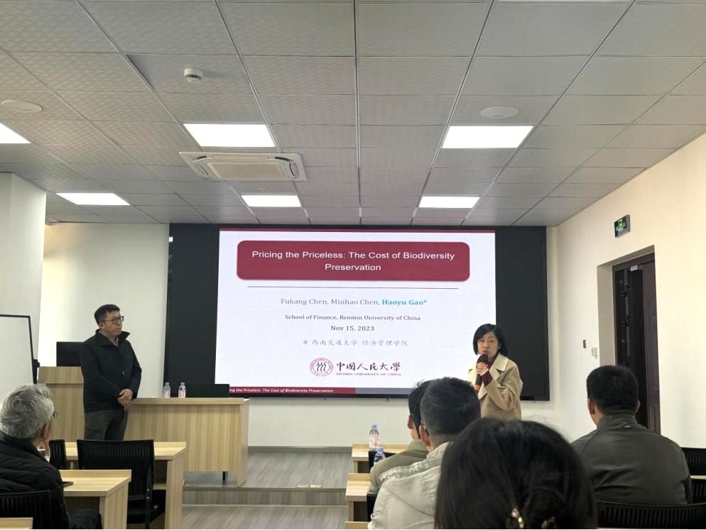 2023年11月15日下午14:00,中国人民大学财政金融学院高昊宇教授应邀在九里校区零号楼0819室为公司师生作题为“Pricing the Priceless: The Cost of Biodiversity Preservation”的学术讲座。此次讲座由学院副经理周嘉南教授主持,学院部分教师及研究生参加此次活动,周嘉南教授首先对高昊宇教授的学术成果进行了介绍,同时对高昊宇教授的到来表示热烈的欢迎与感谢。