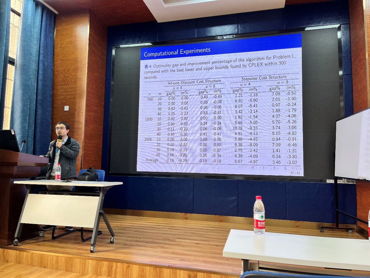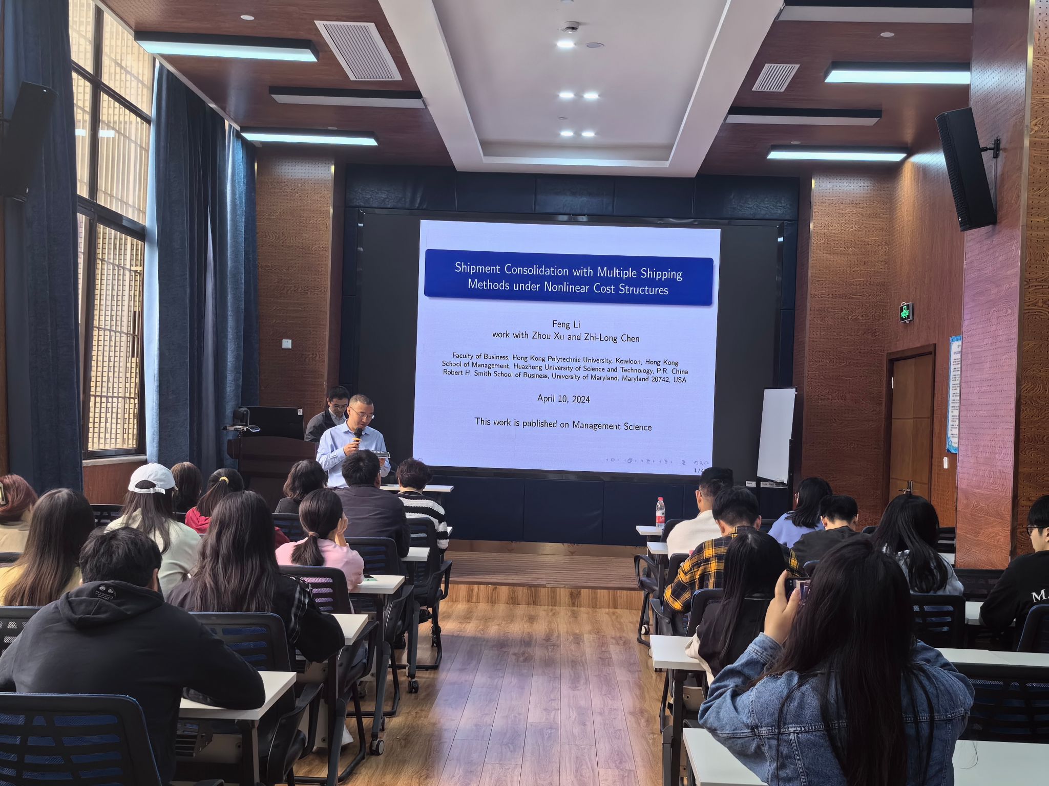 2024年4月10日,华中科技大学李锋教授应邀在HAHA体育为公司报师生分享题为“基于非线性费用函数下多运输模式的订单匹配问题”的学术讲座。本次学术活动由学院副经理聂佳佳教授主持,学院部分教师及研究生参加了此次学术活动。