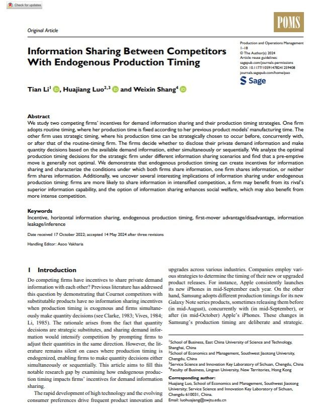 HAHA体育罗华江老师于2024年6月在UTD 24期刊Production and Operations Management在线公开发表题为《Information Sharing Between Competitors With Endogenous Production Timing》的论文。
