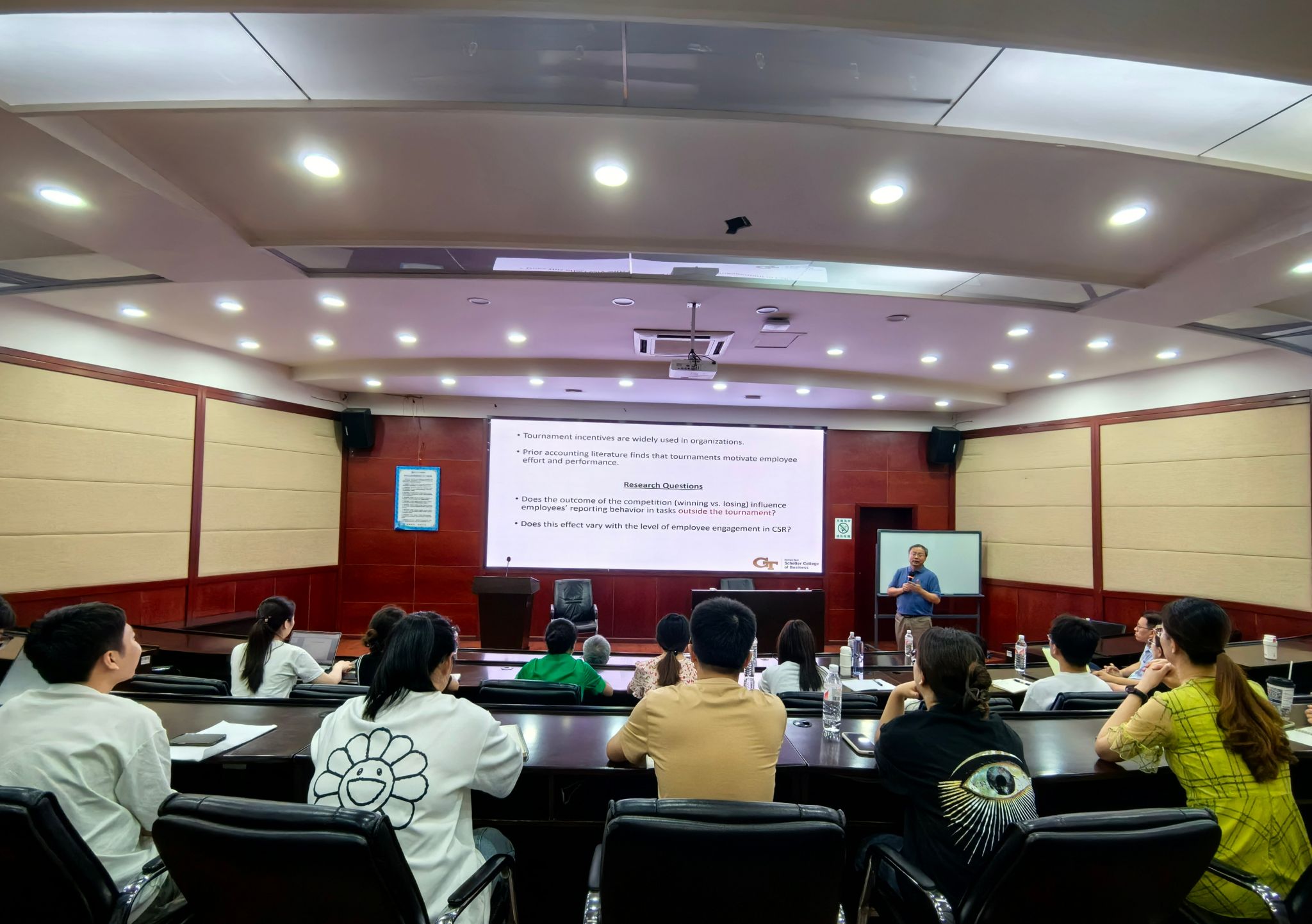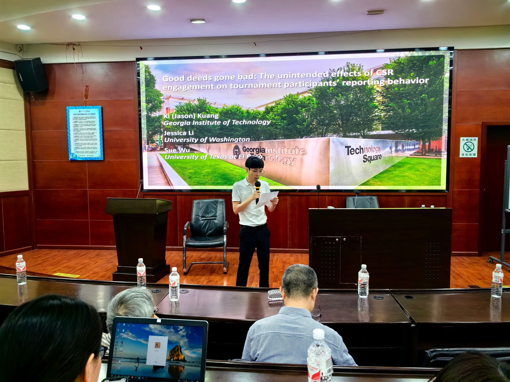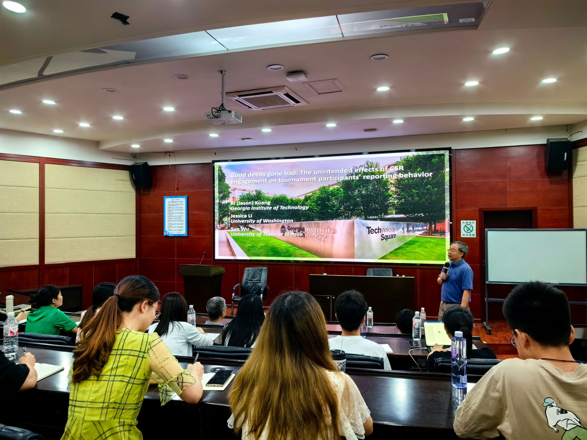 2024年6月28日下午,美国佐治亚理工学院况熙教授应邀在HAHA体育开展题为“Good deeds gone bad: The unintended effects of CSR engagement on tournament participants’ reporting behavior”的学术报告,副经理马锋主持了此次学术讲座,学院部分教师及研究生参加了此次活动。副经理马锋介绍了况熙教授的学术背景及研究成果,并对况熙教授的到来表示热烈的欢迎和诚挚的感谢。