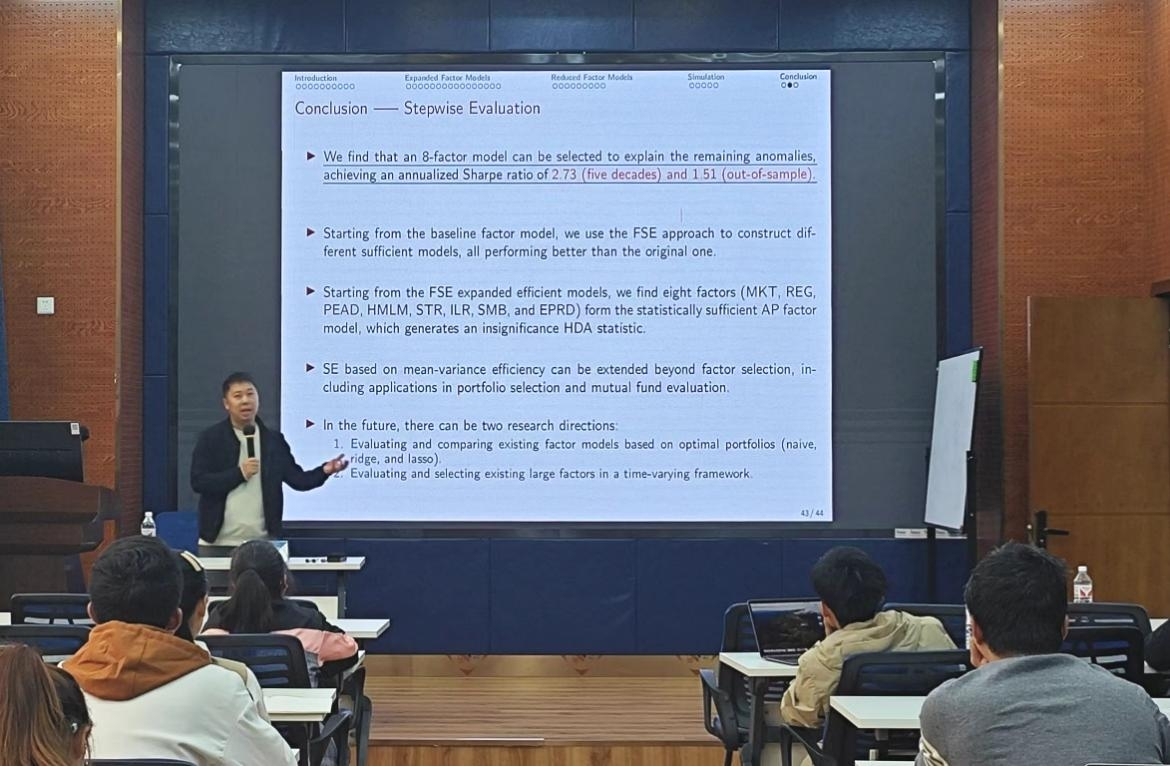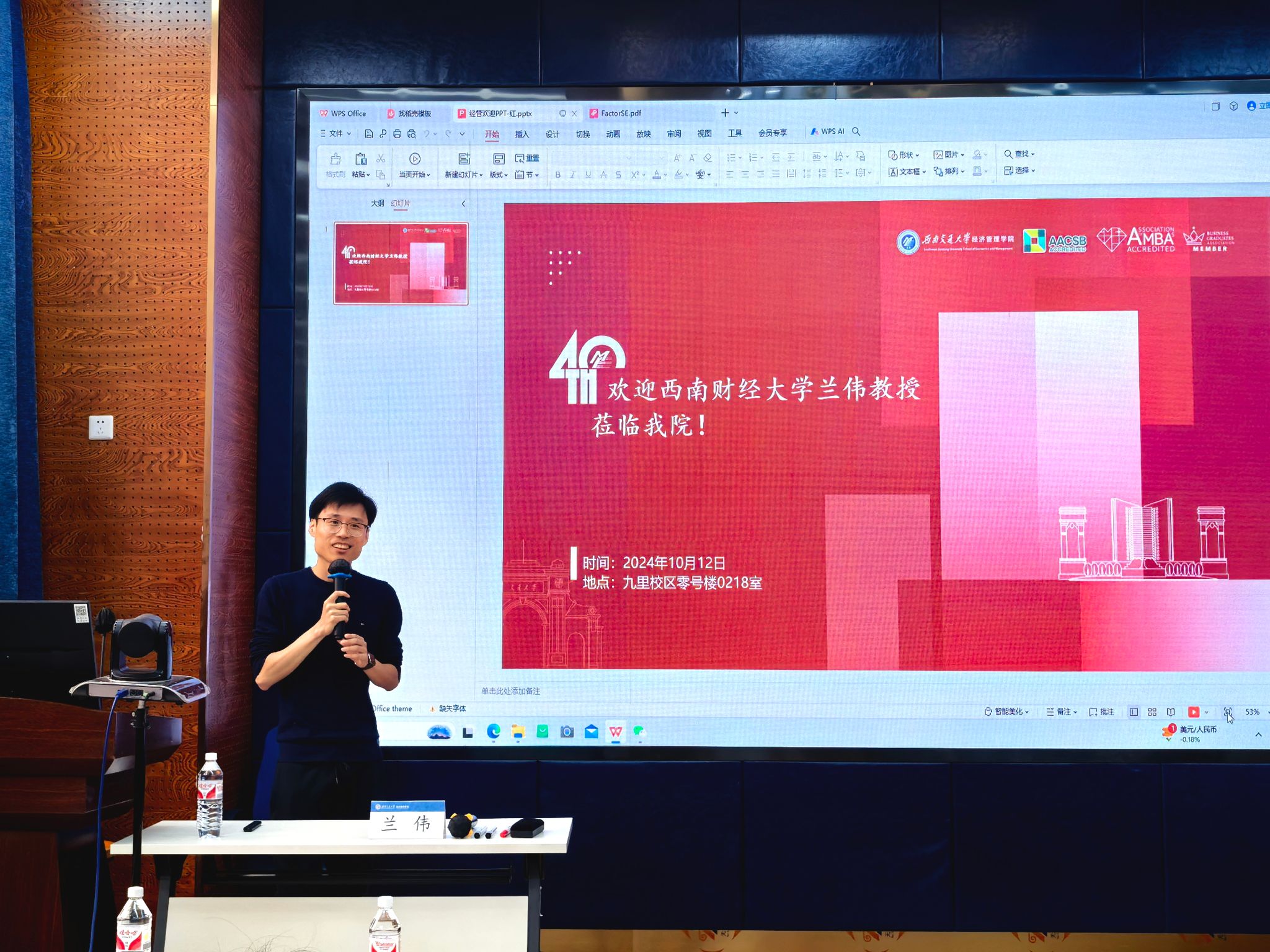 2024年10月12日上午,西南财经大学统计学院副经理兰伟教授应邀在九里校区HAHA体育为公司师生带来了一场题为“大规模金融因子评估和筛选”的学术讲座。本次学术活动由公司副经理马锋主持,学院部分教师及研究生参加此次讲座,马锋副经理介绍了兰伟教授学术成果,并对兰伟教授到来表示欢迎与诚挚的感谢。