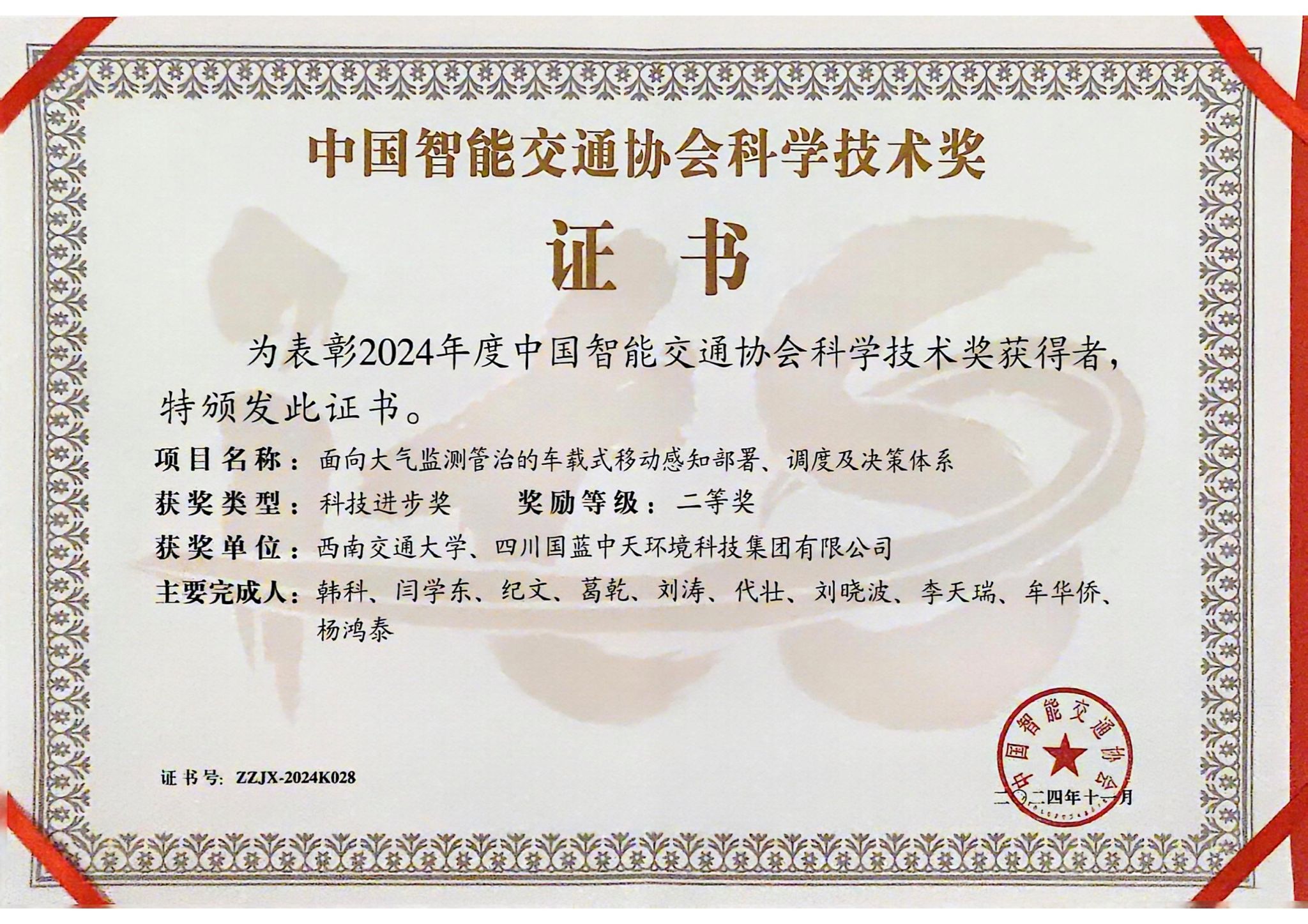 近日,中国智能交通协会公布了2024年度科学技术奖的获奖名单,由公司韩科教授牵头完成的《面向大气监测管治的车载式移动感知部署、调度及决策体系》荣获科技进步二等奖(完成单位:哈哈体育、四川国蓝中天环境科技集团有限公司)。这一荣誉是哈哈体育在“交通+环境+管理”交叉领域取得的重要进展,也是HAHA体育在行业牵引科研方面取得的代表性成果。