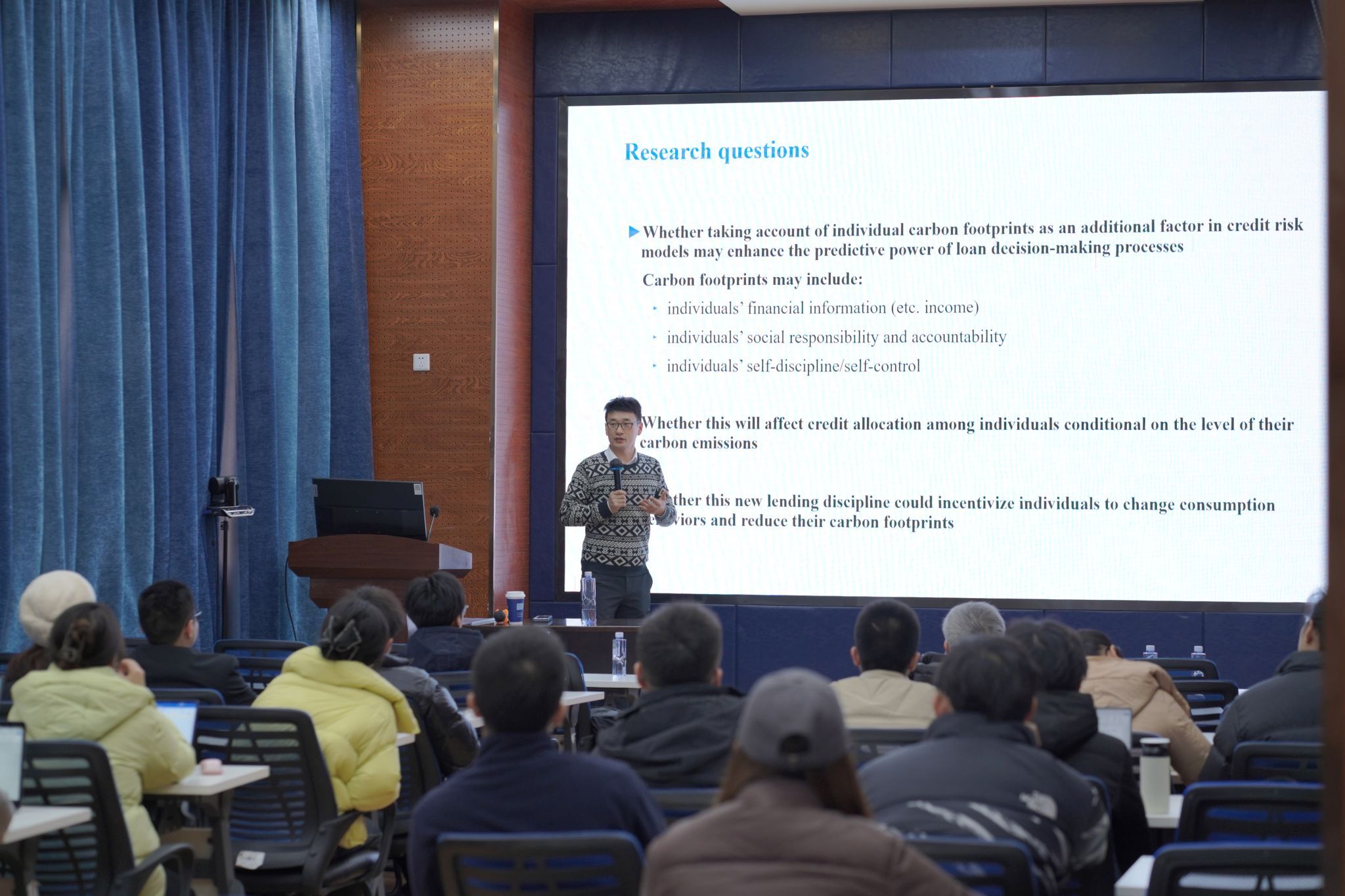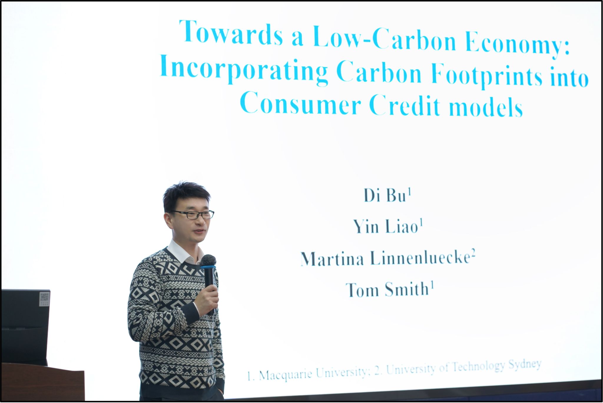 2025年1月10日下午,麦考瑞大学部迪副教授应邀为公司师生作题为“Towards a Low-Carbon Economu:Incorporating Carbon Footprints into Consumer Credit models”的学术讲座。本次学术活动由学院副经理马锋主持,公司学系教师及研究生30余人参加此次学术活动。