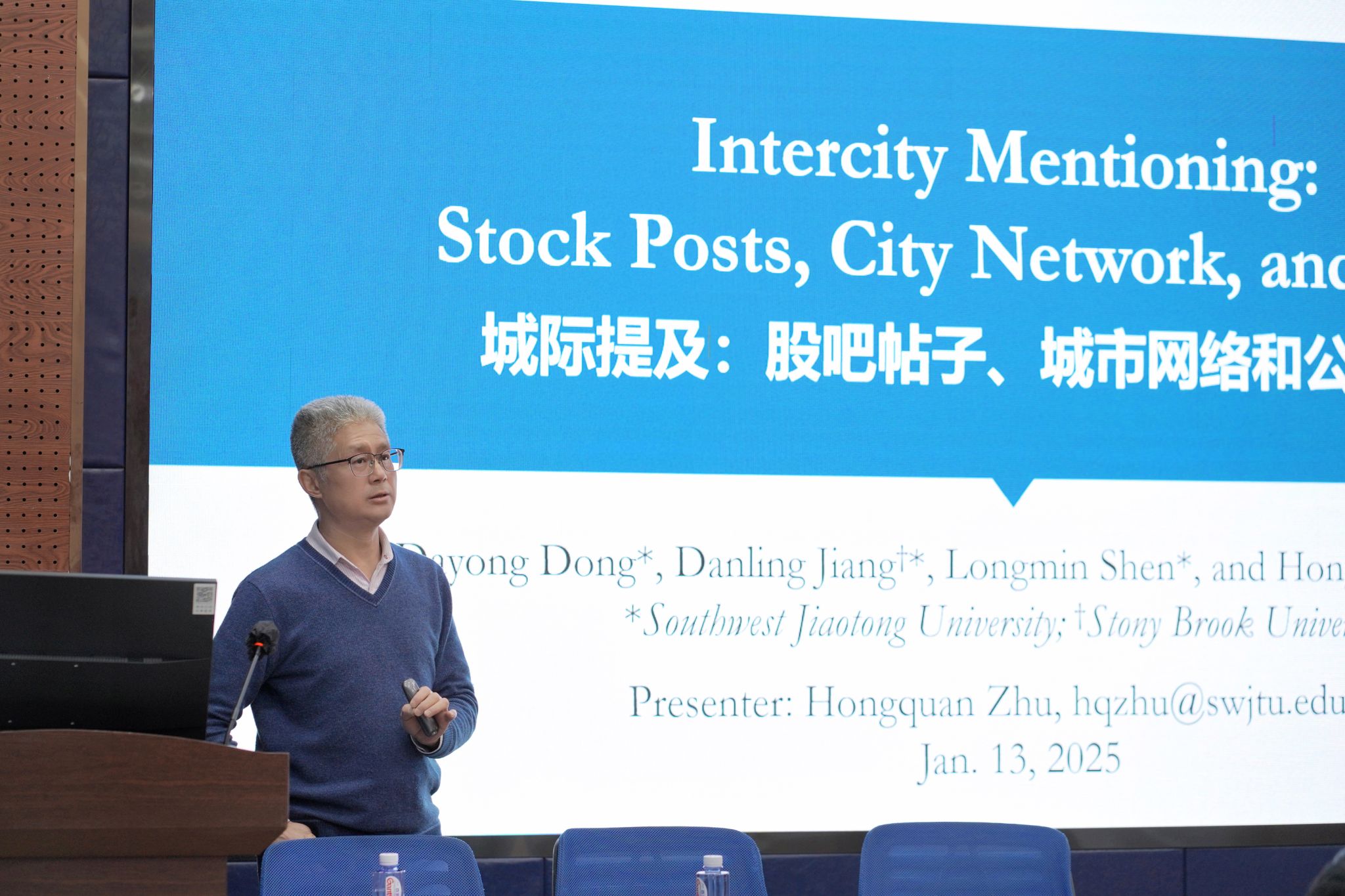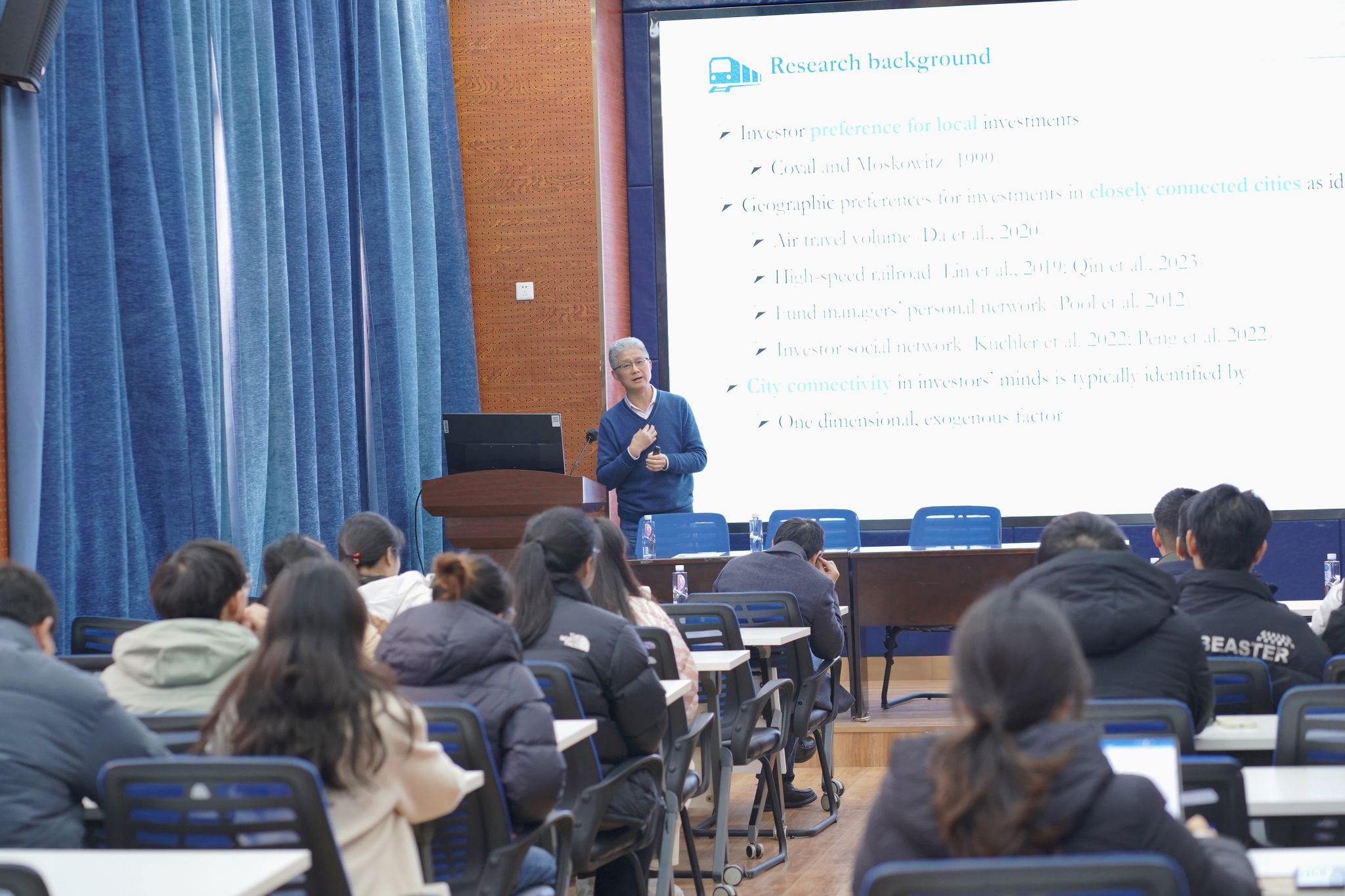 朱教授以其最新的研究成果为中心,对题目采用倒叙的方式解读来展开演讲,从东方财富网股吧的发帖内容出发,逐步深入到城市网络的构建。他以一个引人深思的问题开场:“大家可能会好奇,构建城市间关联会影响公司的市场表现吗?”以此激发听众的兴趣。