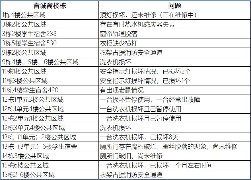 宿舍楼出现公共区域物品损坏时,几乎都能得到良好的解决。但目前九里校区眷诚斋1-15栋员工宿舍楼仍然存在许多亟需解决的问题。其中,最多的就是洗衣机的损坏问题。由于每层楼几乎只配备一台洗衣机,洗衣机的损坏会切实地影响到同学们的日常生活,尤其是在寒冷的冬天。另外,消防通道占用、门灯损坏等问题也需尽快解决。