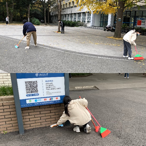 第五小组组织成员前往图书馆、教学楼等周围区域进行志愿服务活动,通过打扫教学楼前的银杏落叶、整理共享单车、清理建筑周围的垃圾等,为大家提供了一个干净、舒适的学习和生活环境。