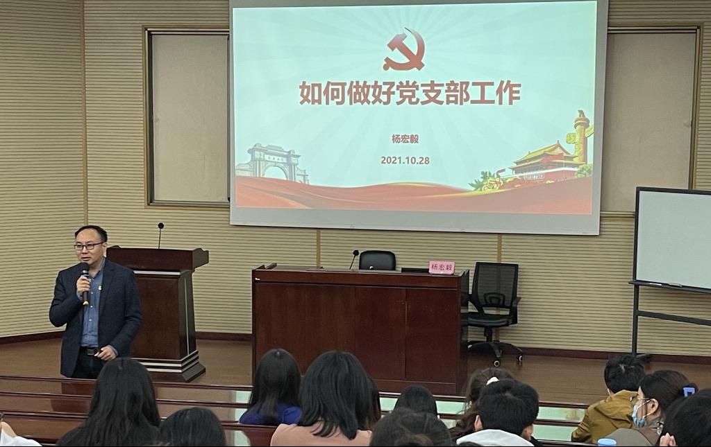 公司党委副书记杨宏毅从四个方面向各党支部委员们系统讲解了如何做好党支部工作。他首先详细解读了党支部的设置,支委会的选举、任期、流程以及各个党支部委员职责等内容。他强调,党支部书记要高度重视自己的带头作用,要带领本支部党员扎实开展好各项工作和活动。接着,他对党支部“三会一课”制度进行了强调,对党支部开展的各种活动类别进行了详细的介绍,加深了党支部委员们特别是2021级新生党支部委员们对党建工作的理解和认识。在第三部分,杨宏毅按照《中国共产党发展党员工作细则(试行)》系统介绍了发展党员的流程及注意事项,并要求党支部委员要进一步明确自己的工作职责,树立好工作信心,认真学习党支部各项工作条例及工作要求,严格把好发展党员的标准和流程,注意党员发展的各个时间节点,按要求及时做好归档等工作。最后,杨宏毅举例说明了党支部工作和发展党员过程中常见的各种问题,并现场对各种党建工作疑题进行了解答。