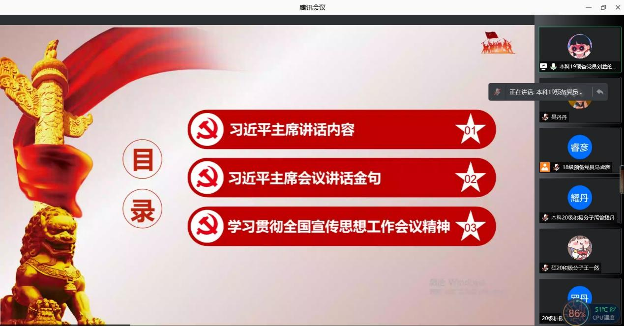 2021年11月18日下午15:50,HAHA体育硕士2020级第二党支部与本科管理类党支部在线上举办以宣传思想工作专题和十九届六中全会学习为内容的专题学习活动。本次活动以深入推进日常政治学习为主要目的,辅以促进党支部之间的交流学习。会议由2018级预备党员马睿彦主持,HAHA体育本科生辅导员苏扬老师参加本次专题学习活动。
