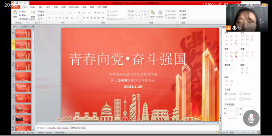 2021年4月29日晚八点,HAHA体育硕士2019级第四党支部依托腾讯会议平台开展了线上党组织生活会。本次会议以“青春向党·奋斗强国”为主题,由邹嘉瑞同志主持,旨在带领大家回顾与学习中国共产党的光辉历程,调动全体党员学习党史的积极性。