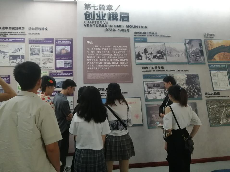 在随后的讲解中,我们了解到了“一班四院士”的事迹、抗战时期的交大多次搬迁、“交大五老”以及知名员工茅以升、竺可桢、林同炎、黄万里的卓越功绩。二十世纪六、七十年代,学校内迁四川峨眉,条件艰苦,历经坎坷,但师生们励精图治,建校、教学齐抓并进,开始了新的征程。1977年,国家恢复高考制度,公司进入了新的发展时期。1979年,公司开始规划建设成都校区,1989年,总校迁往成都。2002年在成都犀浦建设新校区,遂形成今日“一校、两地、三校区”的办学格局。