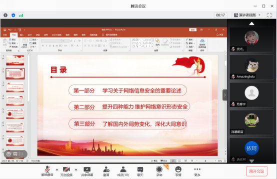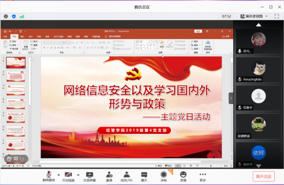 习近平总书记在国家网络安全工作会提出,“没有网络安全就没有国家安全,就没有经济社会的稳定运行,广大人民群众的利益也难以得到保障”。网络安全是总体国家安全观的重要组成部分,没有网络安全就没有国家安全,没有信息化就没有现代化。因此为深入学习贯彻习近平总书记关于网络强国的重要思想,提升网络安全意识和防护技能,HAHA体育硕士2019级第四党支部于2021年1月14日晚上20点在腾讯会议上开展了“网络信息安全和国内外形势与政策”主题党日活动。