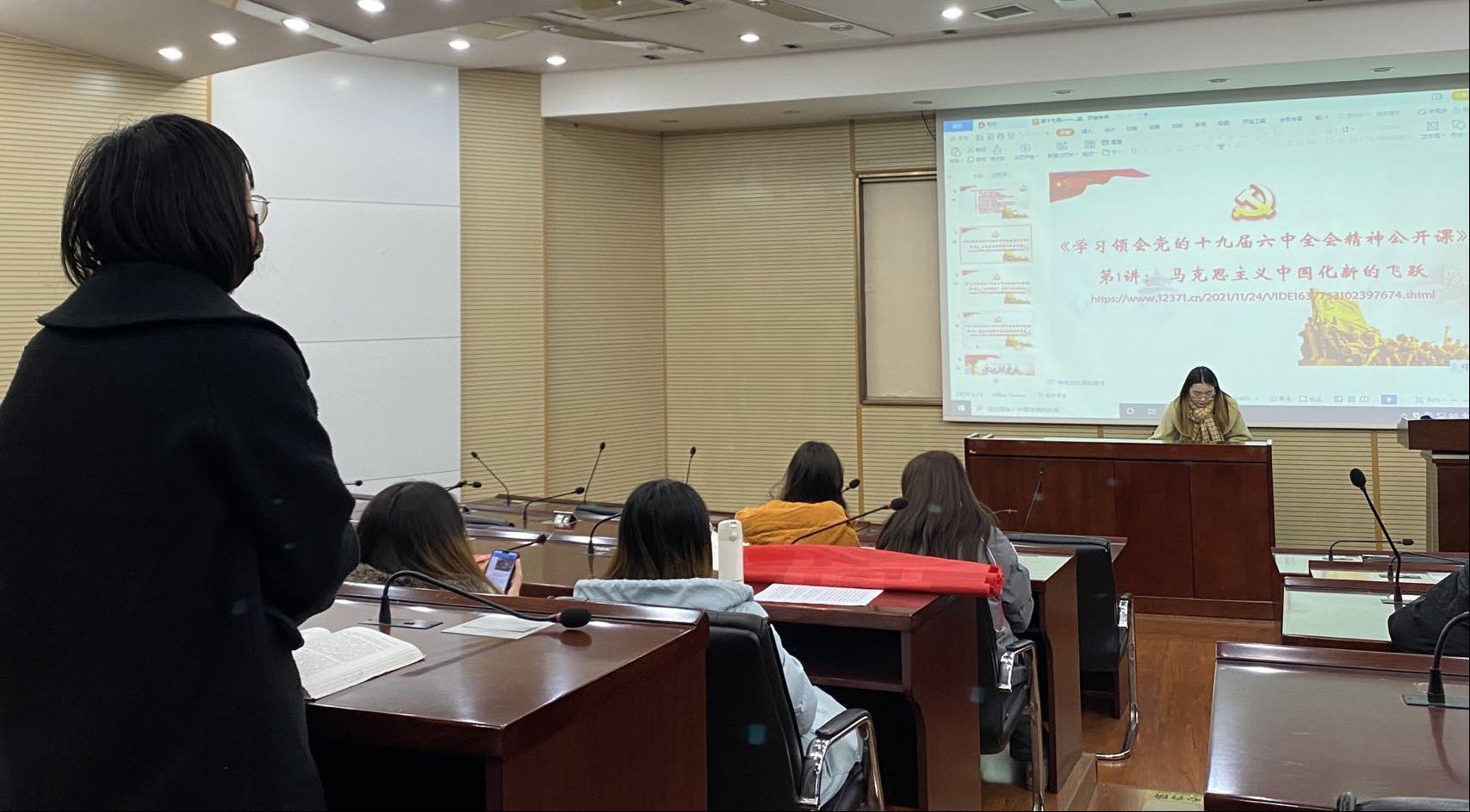 首先进行本周政治学习,由支部副书记文静柯同志组织学习,本次学习的主要内容为十九届六中全会,重点学习“两个确立”方针以及关于“新发展“理念的解读。观看完学习视频后,王丹等三名同志发表自己的感悟。