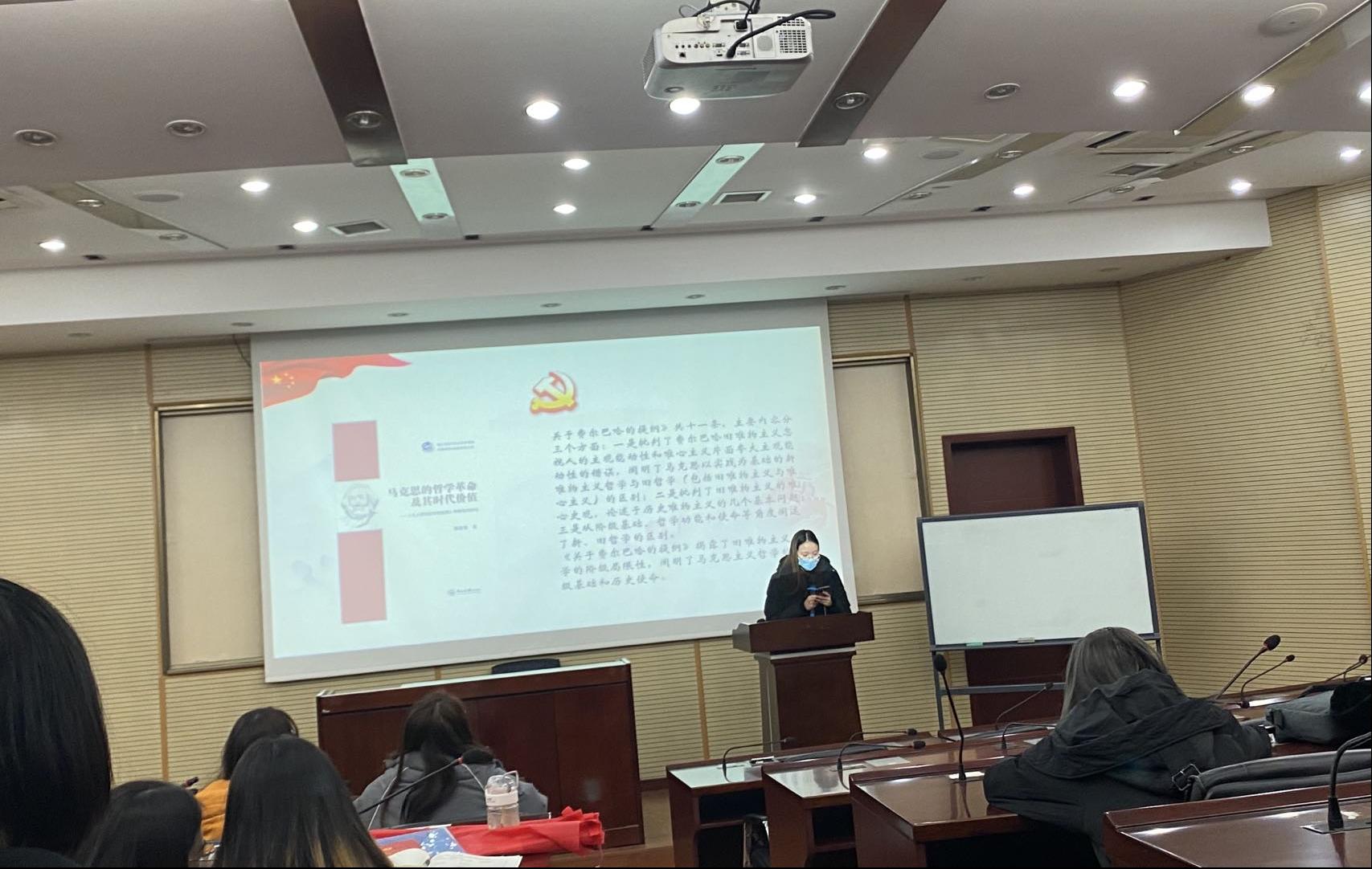 第四位夏晶同志分享了阅读《关于费尔巴哈的提纲》的心得体会。《关于费尔巴哈的提纲》是马克思主义哲学的纲领性文件之一,标志着马克思的哲学的基本思想的形成。该文是为了深入批判费尔巴哈哲学并与其划清界限而写的提纲。
