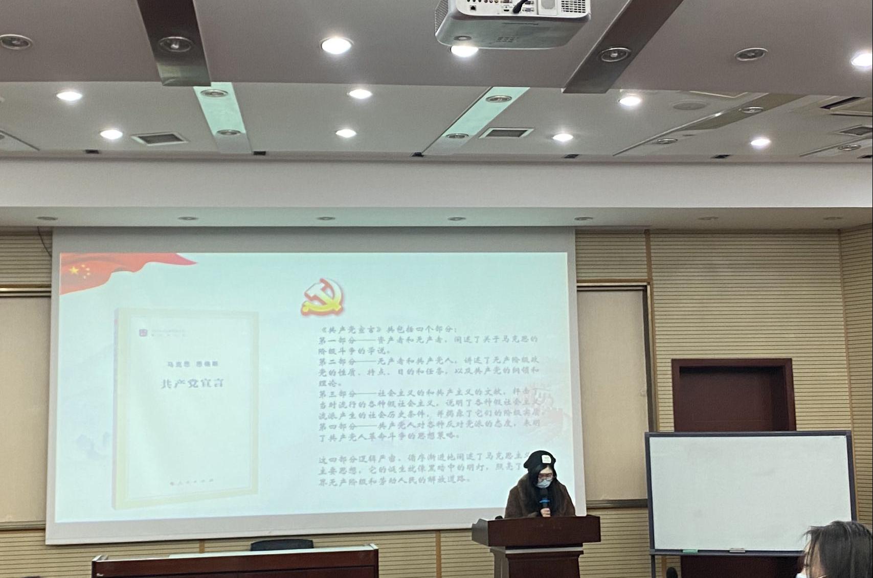 第二位杜婉婷同志分享的书籍是《共产党宣言》,《共产党宣言》的发表,标志着马克思主义的诞生,在人类思想史上留下了一部不朽的经典之作。从宣言中,她认识到“为中国人民谋幸福”表达了党的根本宗旨。中国共产党人的初心和使命,就是把马克思主义基本原理同中国具体实际相结合而确立的党的宗旨和奋斗目标,是以《共产党宣言》为源头的科学世界观在中国土地上的表达、在党的实践中的体现。
