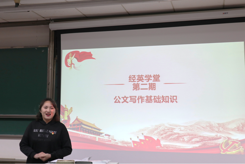 2022年3月31日下午,本科管理类党支部在J0410教室开展了本学期第一次理论学习活动——经英学堂第二期,内容主题为:公文写作基础知识。此次活动由党支部副书记张媛媛老师主持,邀请到了公司党务秘书、组织员李洪辉老师进行讲授。在李洪辉老师的带领下,支部成员对公文写作基础知识有了深入的了解、学习。