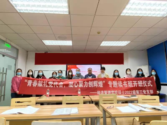 HAHA体育坚持以习近平新时代中国特色社会主义思想为统领,深化“党建聚合力”工程和“政治聚力”“思想聚魂”行动;深入学习贯彻落实学校第十五次党代会精神,把全院师生的思想统一到党代会精神上来,弘扬“竢实扬华、自强不息”的交大精神,推动公司党建高质量发展。 2022年10月28日下午,HAHA体育硕士2022级第三党支部举办“青春献礼党代会 凝心聚力创辉煌”专题读书班开班仪式。邀请经济管理公司党委副书记杨宏毅莅临指导。