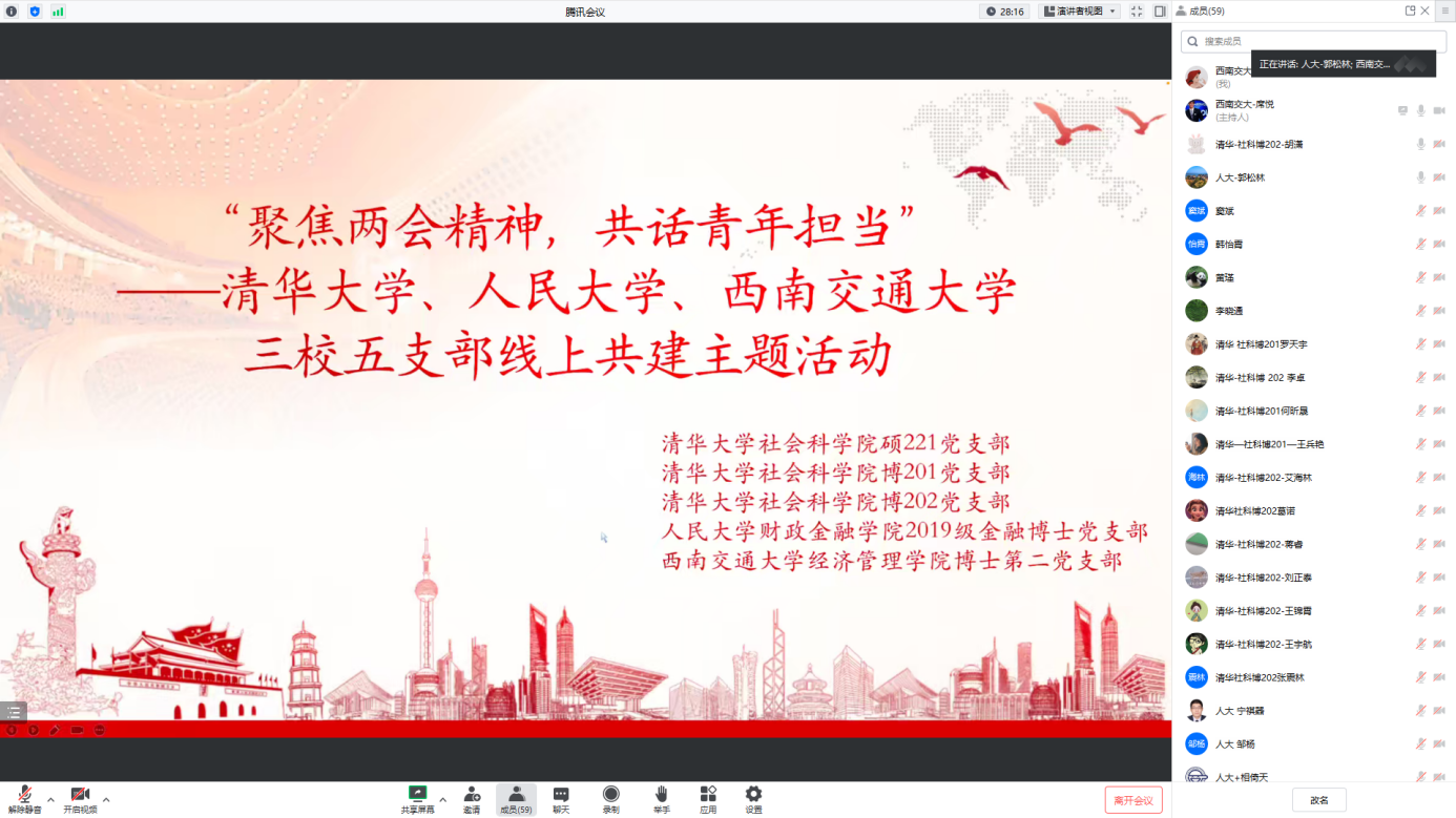 东风浩荡,奋进新程;凝心聚力,奋楫扬帆。为响应全党关于学习“两会”精神的号召,深化支部间联合共建,2023年4月11日晚7点30分,HAHA体育博士第二党支部联合清华大学社科硕221党支部、社科博201党支部、社科博202党支部、中国人民大学财政金融学院2019级金融博士党支部,以线上腾讯会议形式召开“聚焦两会精神内涵,共话青年担当”为主题的支部共建学习活动。此次会议由HAHA体育博士第二党支部书记席悦同志主持,哈哈体育、清华大学和人民大学的五个党支部近百余名党员同志参加了此次活动。