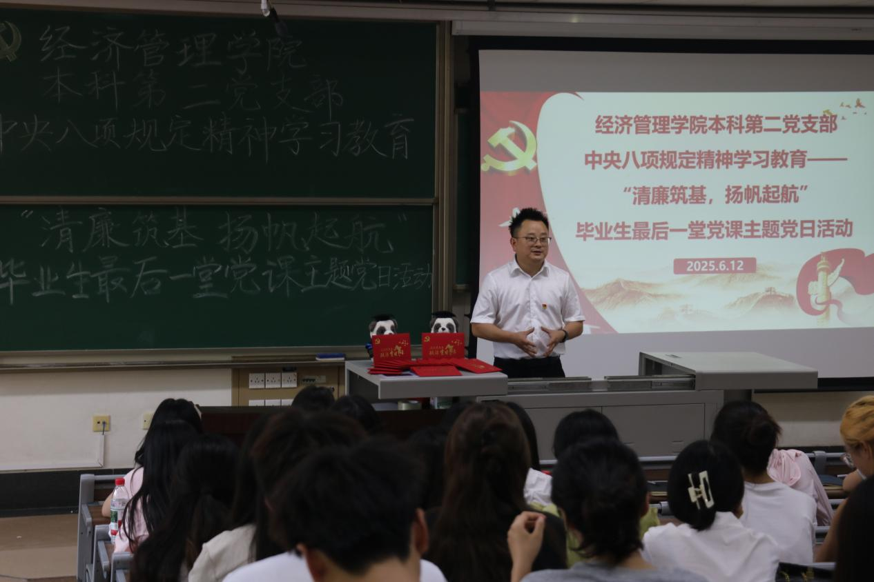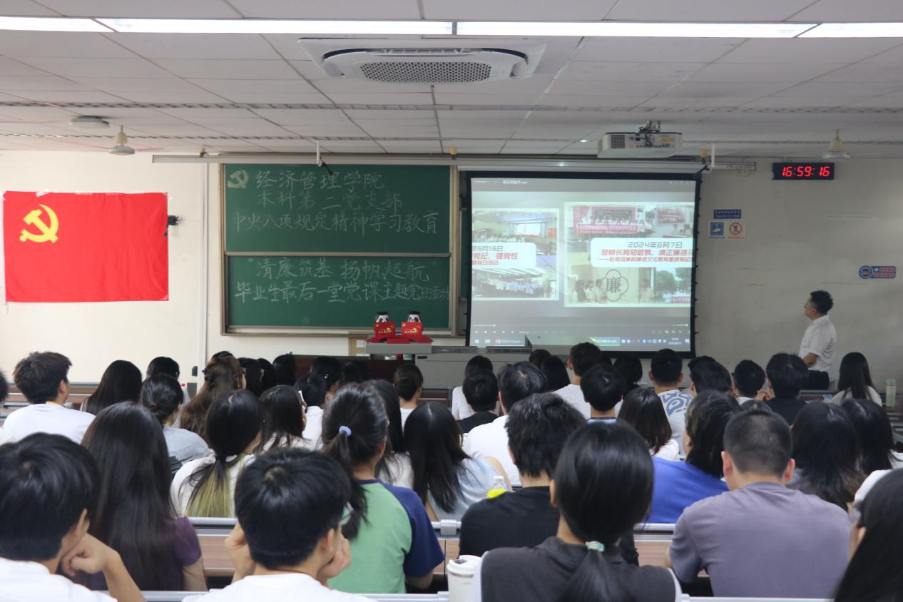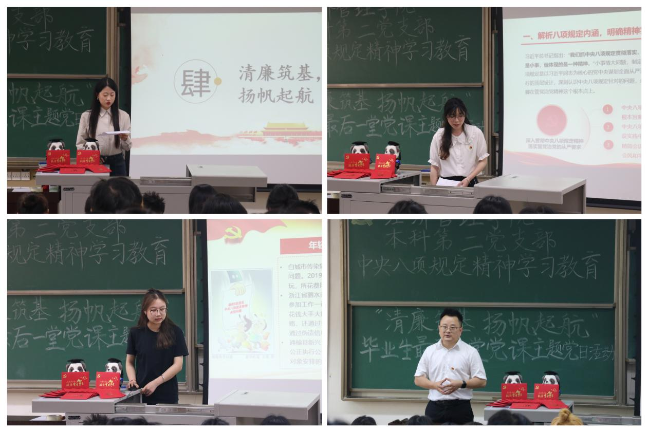 为深入贯彻中央八项规定精神学习教育,强化党员的廉洁自律意识,进一步增强毕业生党员的党性意识和社会责任感,6月12日,HAHA体育本科第二党支部于J4310开展深入贯彻中央八项规定精神学习教育——“清廉筑基、扬帆起航”毕业生最后一堂党课主题党日活动。