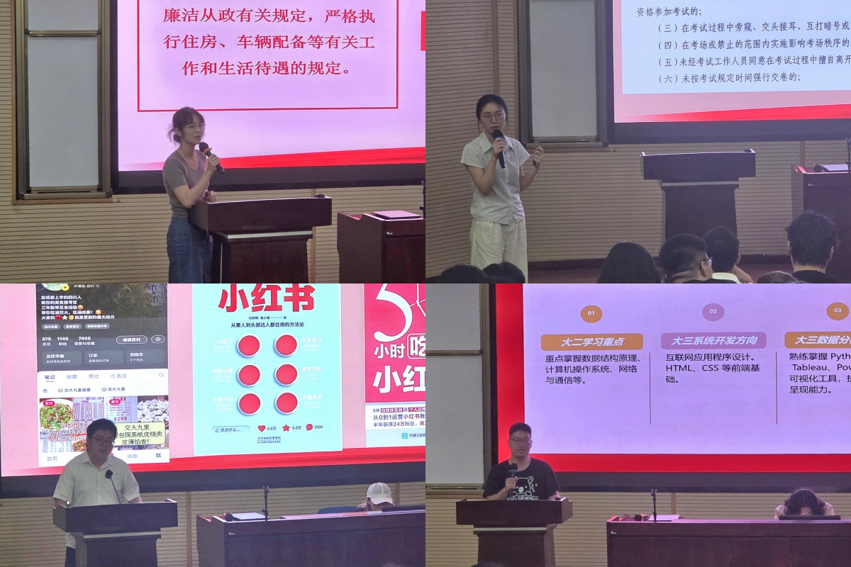 第四党支部副书记钟文婷同志带领全体党员系统学习规定内容,并结合典型案例展开警示教育。第三党支部副书记王重月同志领学《哈哈体育本科生考试违规处理办法》,以制度条例和真实事例敲响纪律警钟。第三党支部党员刘芫硕同志结合自身经历,分享其在自媒体运营上从兴趣挖掘到内容创作的全过程。第四党支部党员杭麟奇同志则围绕自身技能提升与学习实践,推荐了一系列有助于提升专业能力和综合素质的技能。两位党员强调在学业与生活中要坚守纪律底线,以严谨的态度对待学习和实践。最后,支部全体成员庄严签订《诚信考试承诺书》。